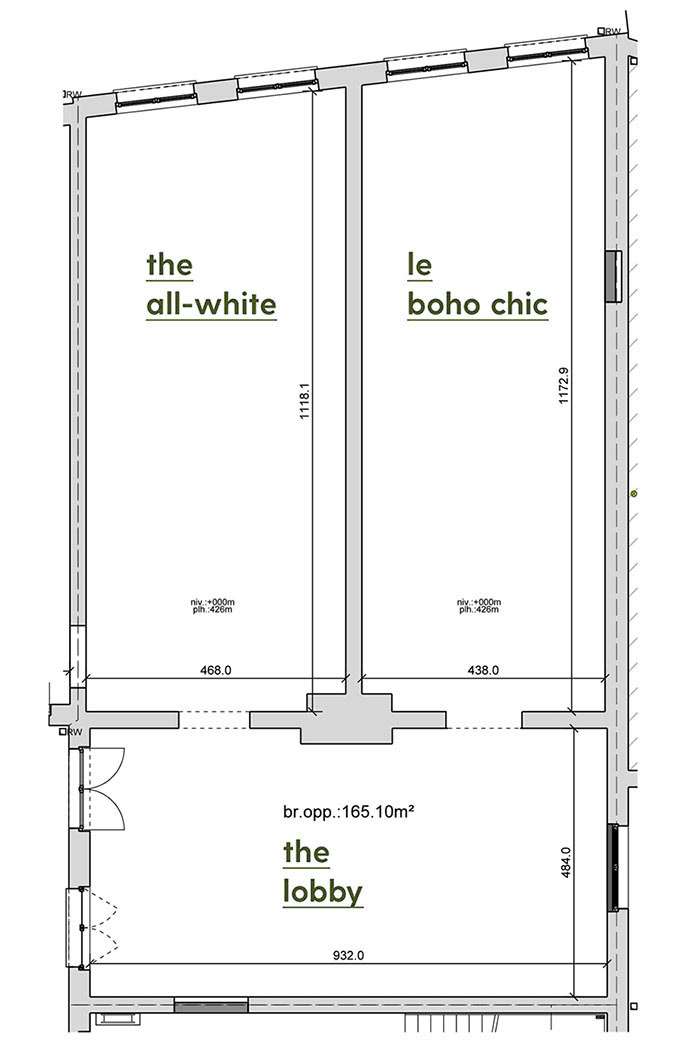 Antwerp Loft is about 166 square meters large (see plan below), with 2 added mezzanines of about 20 m2 each. The lobby is 9,32 m long and 4,84 m wide. The All-White is 11,81 m wide and 4,68m wide. And Le Boho Chic is 11,73 long and 4,38 m wide. The ceilings are 4,26 m high, which make them excellent for video- and photography purposes. There's even a possibility to attach extra lights (with magic arms) and rig them to the ceiling-profiles, thus creating a custom 'technical'-ceiling.